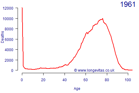The development of the distribution of deaths by age can reveal a lot about a population. Animation 1 shows the development of the distribution of deaths for males in England and Wales since 1961. It shows the very welcome fall in infant mortality on the left, but it also shows the steady rightward drift in the distribution at older ages.
