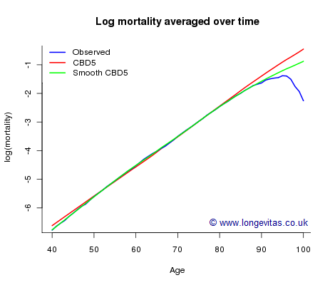 The forecasting of future mortality at high ages presents additional challenges to the actuary. As an illustration of the problem, let us consider the CMI assured-lives data set for years 1950–2005 and ages 40–100 (see Stephen's blog posts on selection and data volumes). The blue curve (partly hidden under the green curve) in Figure 1 shows observed log(mortality) averaged over time. A striking feature of this curve is the suggestion of data-quality issues above age 95: